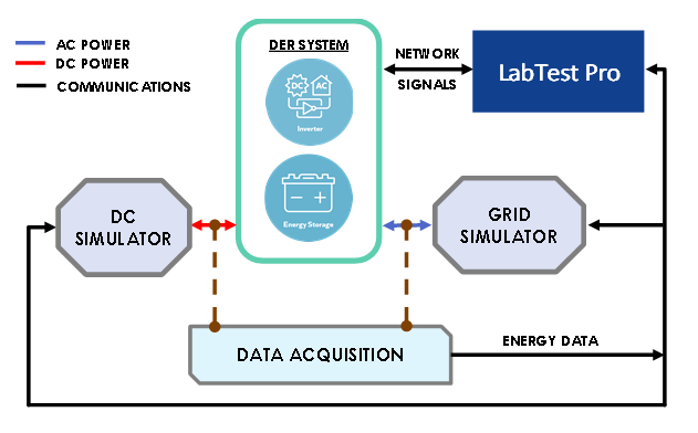 LabTest Pro software automates the certification procedure by communicating with laboratory hardware through Ethernet, serial, or GPIB programmatic interfaces. Generally, laboratory setups include a DC power supply, AC grid simulator, data acquisition system (DAQ), and the Equipment Under Test (EUT). With this equipment, test sequences are executed based on the standard requirements, log data is captured, and the results are processed to assess the pass/fail performance of the EUT.