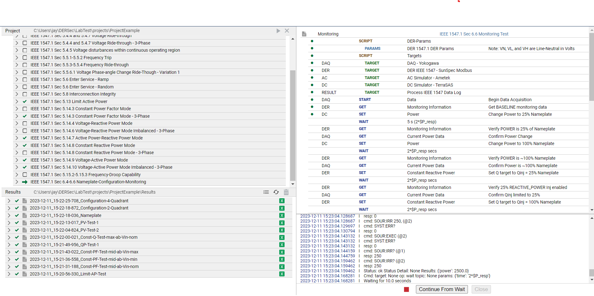 LabTest Pro runs IEEE 1547.1 certification tests based on user-selectable equipment and test configuration parameters. The tests are executed in accordance with the interconnection standard and then the DAQ data is post-processed to generate the pass/fail results based on the certification criteria. The final analysis is in Microsoft Excel format with highlighted areas of certification success or non-compliance.