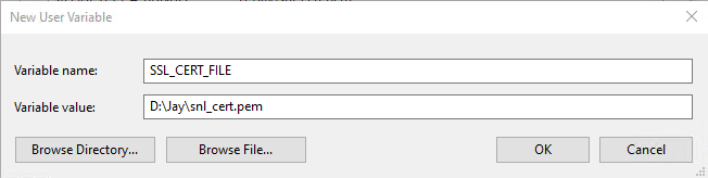 DERformat(*.crt)and will need to be converted to a.pemfile. You can useOpenSSL to do this with openssl x509 -inform der -in cert.cer -out cert.pem. - Then set your environment variables to point to the .pem file for: